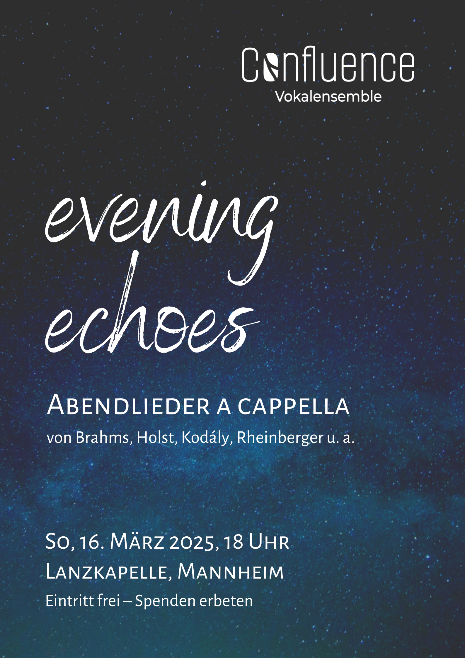 Das neu gegründete Vokalensemble Confluence lädt am Sonntag, den 16. März um 18:00 Uhr zu abendlichen Klängen in die Lanzkapelle Mannheim ein. Unter dem Motto „evening echoes“ widmet sich das junge Ensemble Abendliedern verschiedener Epochen. Dabei kreist das Programm immer wieder um den biblischen Text „Bleib bei uns, Herr“, der als Vorlage für die Abendlieder von William Henry Monk, Josef Gabriel Rheinberger und Erhard Mauersberger diente. Dazwischen reihen sich Stücke wie das berühmte „Sleep“ von Eric Whitacre, das effektvoll den Moment des Einschlafens einfängt, oder “Esti Dal” (Abendlied) des ungarischen Komponisten Zoltán Kodály, eine Vertonung der abendlichen Bitte eines um Schutz suchenden Geflüchteten.